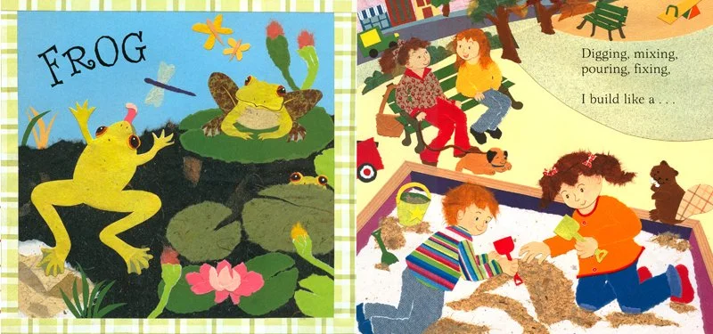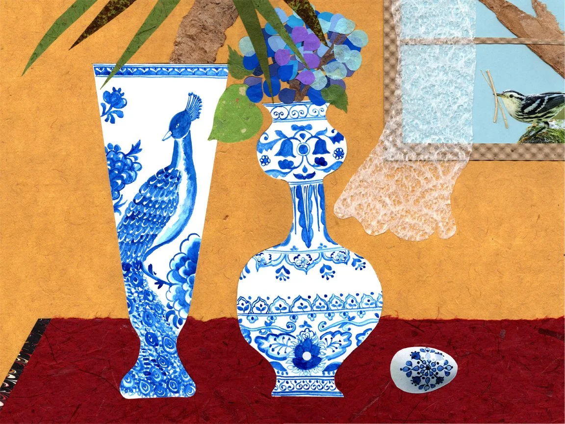My handcrafted, collage illustrations are traditionally made from special papers, fabrics, and found objects. It’s exciting to move materials around, not quite knowing the results until everything is glued down!